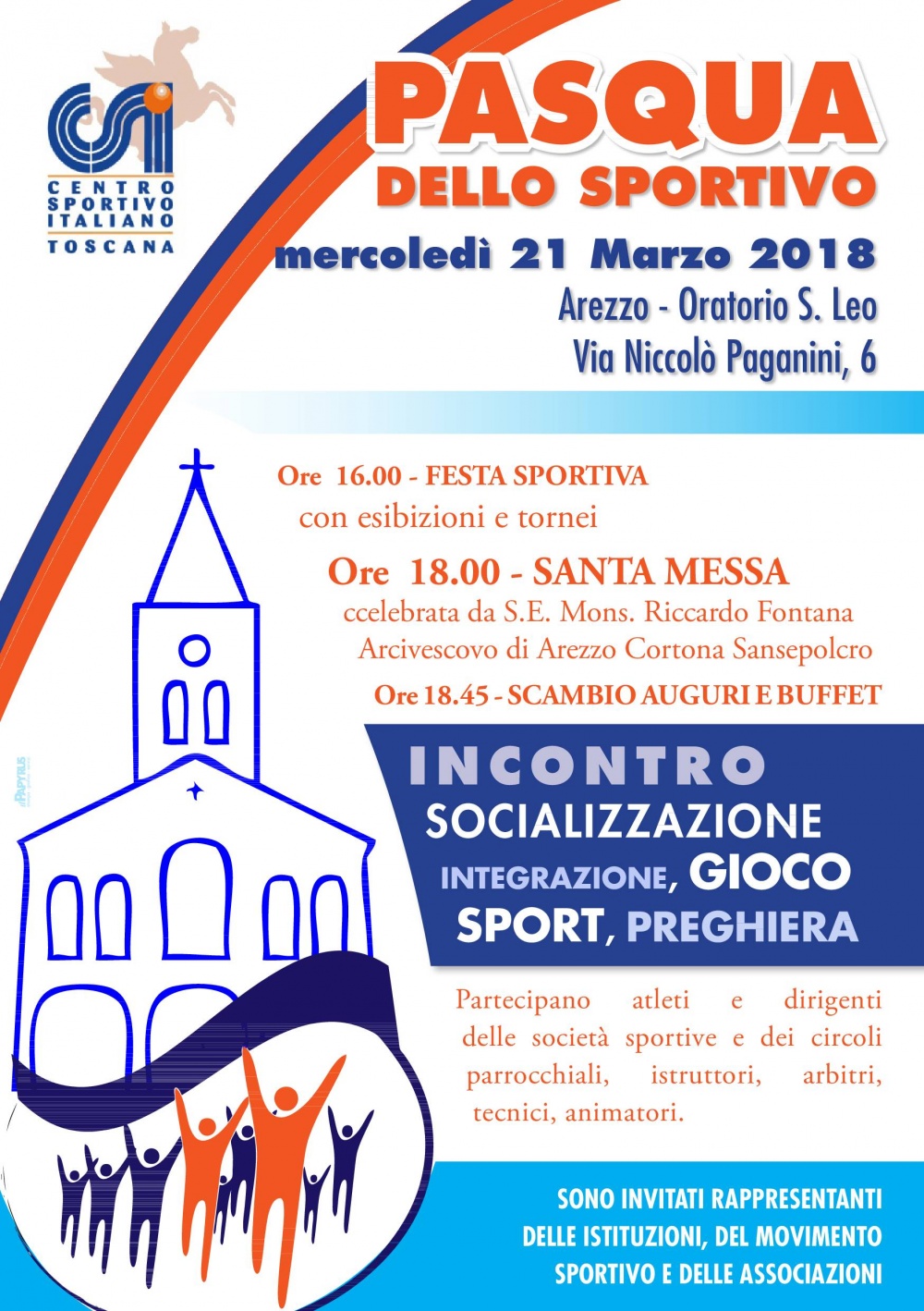 Mercoledì 21 marzo, dalle ore 16,00 ad Arezzo, presso l´oratorio San leo, in via Paganini 6, tutti gli atleti e le società del CSI, festeggeranno la loro Pasqua.