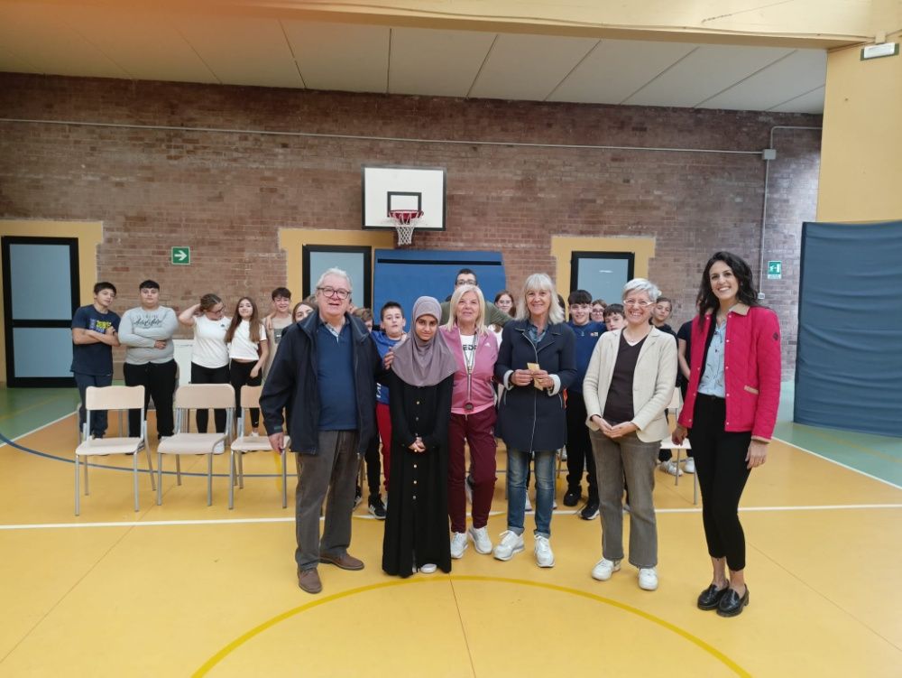 Mario Pertici responsabile del coordinamento della formazione del Centro Sportivo Italiano di Volterra, Jassmine Elkniri studentessa della 2A, laProf. Marcella Ciulli insegnante di Scienze Motorie, la Consigliera Anita Tonna CSI del territoriale di Volterra, la Preside Balatresi, l'Assessore allo Sport (vice sindaco) del Comune di Terricciola Elena Baldini Orlandini che a sua volta ha voluto sottolineare ai ragazzi la vicinanza dell'Amministrazione Comunale ai bisogni, anche formativi, dei cittadini più giovani e quindi certamente alla loro salute ma anche alla loro crescita intellettuale. Avvenuta la premiazione sta già partendo la stagione 2025-26 e gli elaborati del nuovo concorso sono già nelle menti dei nostri giovani disegnatori.