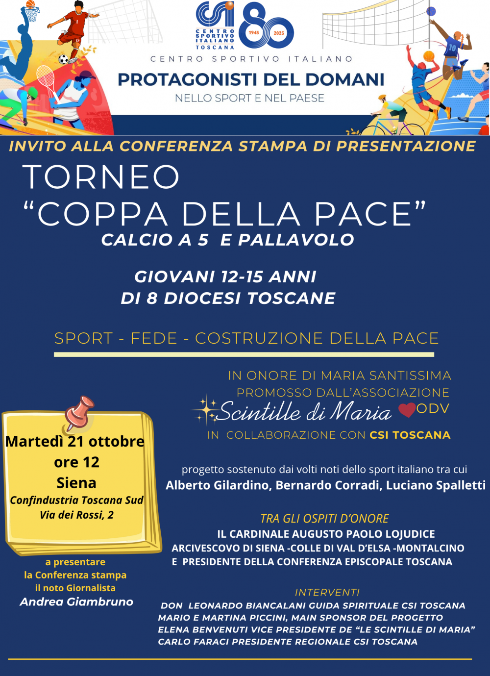 Unire sport, fede e costruzione della pace. È questo l’obiettivo del Torneo “Coppa della Pace”, presentato la mattina di martedì 21 ottobre 2025 a Siena presso Confindustria Toscana Sud e promosso dall’Associazione Le Scintille di Maria – ODV in collaborazione con il Centro Sportivo Italiano della Toscana. Un nuovo progetto che unisce le energie del territorio, offrendo ai giovani un orizzonte di fiducia e la consapevolezza che la pace si costruisce, un gesto alla volta.
